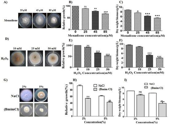 Mineral media supplemented with different concentrations of hydrogen peroxide (H2O2; 0–50 mM), menadione (0–100 µM), Calcofluor white (CFW, 500 µg/mL), Congo red (CR, 1000 µg/mL), and sodium dodecyl sulfate (SDS, 1%) were used to evaluate the oxidative and cell wall stress tolerance of the fungus [62]. Growth inhibition (%) in the presence and absence of stress was analyzed by measuring the relative growth and dry weight biomass described previously. The inhibitory effect of ionic liquid (IL), 1-butyl-3-methylimidazolium chloride (Bmim Cl) with respective control NaCl (2% and 5%) on OH growth and biomass accumulation was measured similarly.