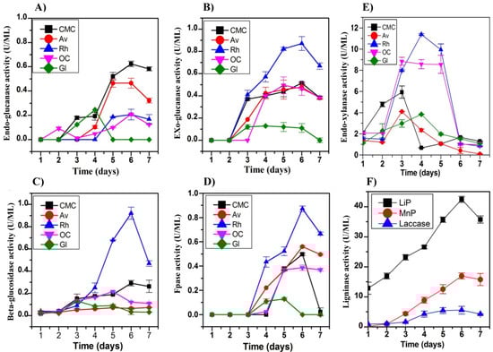 Figure 5. Activities of extracellular lignocellulolytic enzymes of Colletotrichum sp. OH, in the presence of different carbon sources. Time-series plots of endoglucanase (A), exoglucanase (B), β-glucosidase (C), Fpase (D), and endoxylanase (E) production by OH on different carbon sources. (F) Changes in ligninase activities, such as Lac, laccase; MnP, manganese peroxidase; and Lip, lignin peroxidase, in the presence of rice husk as detected by the colorimetric assay. Experiments were performed in triplicate, and the heights of the bars and the error bars indicate the means ± standard error mean (SEM).