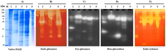 Figure 6. Native PAGE and zymogram analysis of cellulases and xylanase produced by Colletotrichum sp. OH. (A) A 10% PAGE gel and zymogram of (B) endoglucanase, 1% CMC; (C) exoglucanase, 5 µM MUC; (D) β-glucosidase, 5 µM MUG; and (E) endoxylanase, 1% xylan as substrates. Lane (M), molecular weight markers; lane 1, carboxy-methylcellulose (CMC); lane 2, Avicel (Av); lane 3, oil cake (OC); lane 4, rice husk (Rh); and lane 5, glucose (Gl).