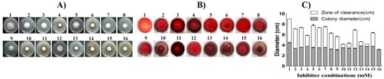 Figure 7. Effect of single and combined inhibitors (IC50; mM) on endoglucanase activity of Colletotrichum sp. OH. (A,B) The mycelium growth and endoglucanase activity of OH and (C) bar graph showing colony diameter and zone of clearance on 1% CMC agar plate supplemented with different combinations of single and mixed inhibitors (combinations 1–16, Table 1) at their respective IC50 concentrations (mM). Experiments were performed in triplicate, and the heights of the bars and the error bars indicate the means ± standard error mean (SEM).