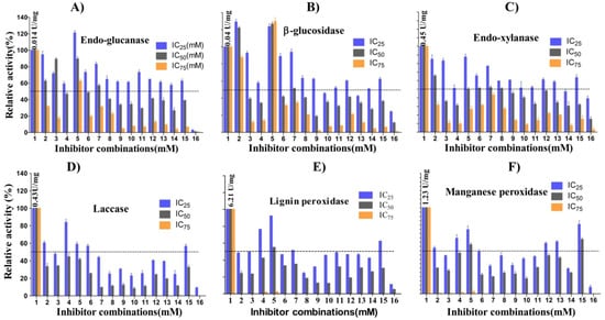 Figure 8. Effect of single and combined inhibitors on the lignocellulolytic activity of Colletotrichum sp. OH. (AF) The relative activity of OH in the presence of different single and combinations of inhibitors (combinations 1–16) at their respective IC25, IC50, and IC75 (mM) concentrations. The dotted lines show 50% inhibition of different enzymes tested in the presence of inhibitors. The values are in comparison with that of the untreated control. Specific enzyme activities as units per milligram are integrated within combination 1. Experiments were performed in triplicate, and the heights of the bars and the error bars indicate the means ± standard error mean (SEM).