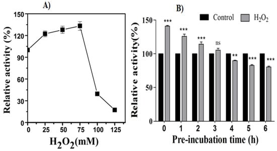Figure 9. Effect of H2O2 on β-Glucosidase activity. (A) Effect of different concentrations of H2O2 (25, 50, 75, 100, 125 mM) on β-Glucosidase activity. The black boxes represent relative BGL activity with respect to no H2O2. The error bars indicate the means ± standard error mean (SEM) from three independent experiments, and (B) pre incubation has advantages in enhancing BGL activity in the presence of exogenous H2O2. H2O2 tolerance of BGL activity was investigated by adding H2O2 to bulk crude enzyme at different time points (0–6 h). The 0 mM H2O2 pre incubation condition in this experiment was crude enzyme incubated in buffer without any H2O2. BGL activity without H2O2 during 0–6 h pre incubation was defined as control (100%). The significant difference (**) was set at p < 0.01, and the highly significant difference (***) was set at p < 0.001 in Tukey’s t-test, compared to the 0% H2O2 pre incubation control. Values are the mean ± SEM of results from three independent experiments.