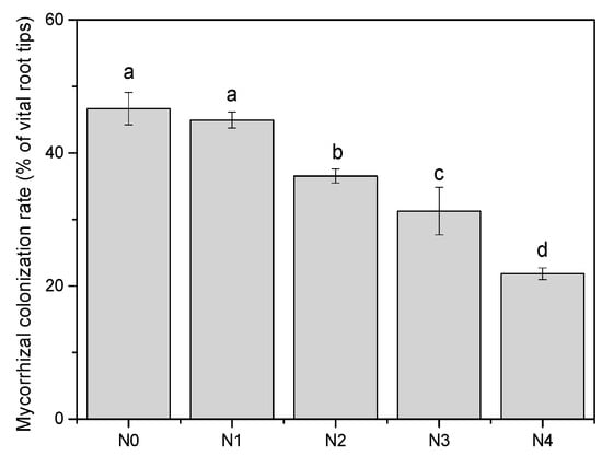 Colonization rate of the ectomycorrhizal fungi of the poplar plantation under five N addition treatments: N0: 0 kg N ha−1 yr−1, N1: 50 kg N ha−1 yr−1, N2: 100 kg N ha−1 yr−1, N3: 150 kg N ha−1 yr−1, and N4: 300 kg N ha−1 yr−1. Values indicate means ± SE (n = 4). Different letters indicate significant differences between means (Tukey’s HSD pairwise comparisons).