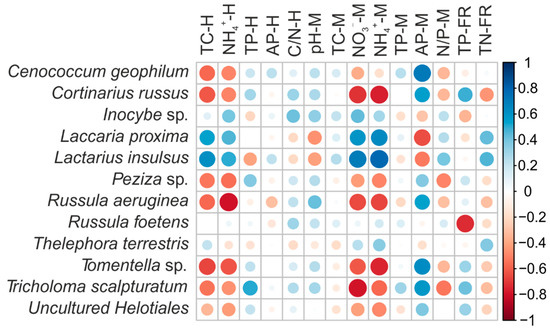 The TP in the humus layer significantly increased the relative abundance of T. scalpturatum, whereas the N/P ratio in the mineral soil was negatively correlated with the relative abundances of Peziza sp. and T. scalpturatum. The pH in the mineral soil significantly reduced the relative abundances of L. proxima. The TP-FR was significantly negatively correlated with the relative abundance of R. foetens and was positively correlated with C. russus. The TN-FR reduced the relative abundance of C. russus but enhanced L. insulsus (Figure 3).
