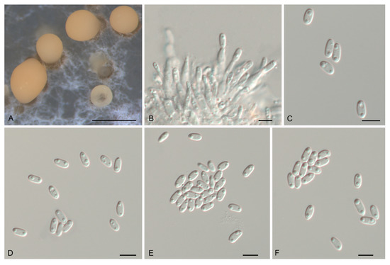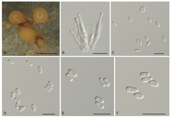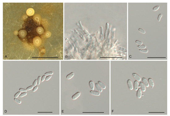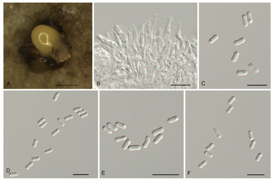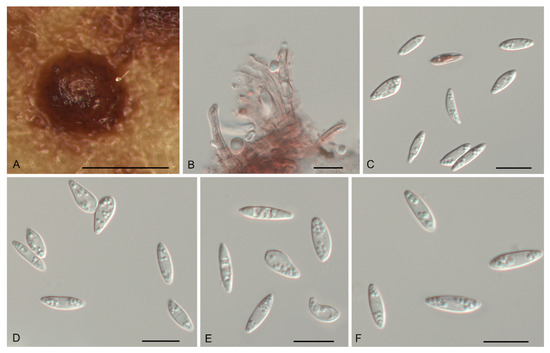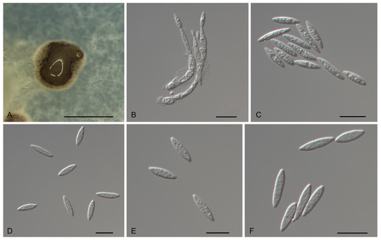 Morphology of Gnomoniopsis hainanensis (CFCC 54376). (A) Conidioma formed on PDA; (B) Conidiogenous cells giving rise to conidia; (C–F) Conidia. Scale bars: A = 300 μm; (B–F) = 10 μm.