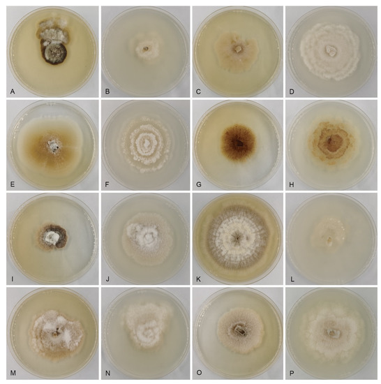 Gnomoniopsis cultures at 10 days. (A) G. silvicola (CFCC 54304) on MEA; (B) G. silvicola (CFCC 54304) on PDA; (C) G. rossmaniae (CFCC 54307) on MEA; (D) G. rossmaniae (CFCC 54307) on PDA; (E) G. guangdongensis (CFCC 54443) on MEA; (F) G. guangdongensis (CFCC 54443) on PDA; (G) G. hainanensis (CFCC 54376) on MEA; (H) G. hainanensis (CFCC 54376) on PDA; (I) G. fagaceaerum (CFCC 54316) on MEA; (J) G. fagaceaerum (CFCC 54316) on PDA; (K) G. silvicola (CFCC 54418) on MEA; (L) G. silvicola (CFCC 54418) on PDA; (M) G. castanopsidis (CFCC 54437) on MEA; (N) G. castanopsidis (CFCC 54437) on PDA; (O) G. daii (CFCC 55517) on MEA; (P) G. daii (CFCC 55517) on PDA.