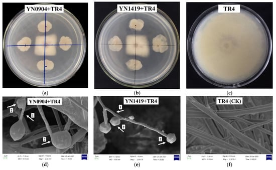 The antagonistic effect of strains YN0904 and YN1419 on TR4. (a) The antagonistic effect of strain YN0904 on TR4; (b) the antagonistic effect of strain YN1419 on TR4; (c) control of TR4; (d) characteristics of hyphae morphology of strain YN0904 antagonistic to TR4 (Arrow 1: The internodes of TR4 hyphae were shortened; Arrow 2: The top of the TR4 hyphae expanded); (e) characteristics of hyphae morphology of strain YN1419 antagonistic to TR4 (Arrow 1: The internodes of TR4 hyphae were shortened. Arrow 2: The top of the TR4 hyphae expanded); (f): characteristics of hyphae morphology of control TR4.