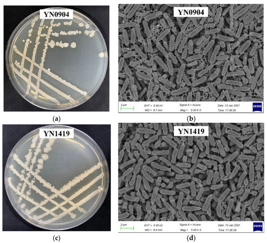 The colonies of endophytic bacteria YN0904 had a light yellow color, opaque and rough surface, middle convex and irregular edge on NA medium after 24 h culture at 37 °C (Figure 2a). Further, scan electron microscopy (SEM) showed that the bacteria were rod-shaped and oval at ends and the size of bacteria was 2.3–2.5 μm × 0.5–0.8 μm (Figure 2b). The colonies of endophytic bacteria YN1419 had a grayish-white color, convex, irregular edge, opaque and rough surface on NA after 24 h of culturing at 37 °C (Figure 2c). SEM showed that the bacteria were rod-shaped and oval at ends; the size of bacteria was 2–3 μm × 0.8–1 μm. (Figure 2d).