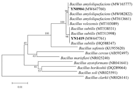 Physiological and biochemical tests of strains YN0904 and YN1419 are shown in Table 3. YN0904 was identified as a Gram-positive bacterium, and showed positive to the test of sucrose, α-D-Glucose, amylose hydrolysis, etc. The isolate YN1419 was also identified as a Gram-positive bacterium, and tested positive for sucrose, α-D-Glucose, amylose hydrolysis, etc. We also determined the optimal temperature and pH for YN0904 and YN1419 growth were 37 °C and 7.0, respectively (Figures S1 and S2).