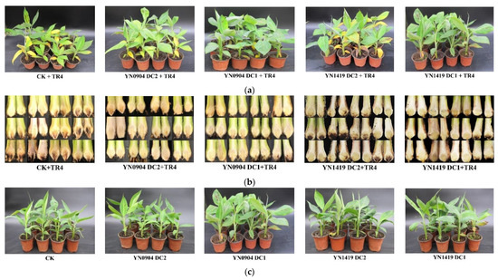 At 40 days post inoculation (dpi), the leaves of the control group (CK + TR4) that had been inoculated only with TR4 turned yellow and the plantlets were stunted, while most leaves of the treated groups DC1 of both YN0904 and YN1419 remained healthy (Figure 4a). Additionally, after splitting the corm, we found that the most corms of treated groups DC1 and DC2 of both YN0904 and YN1419 were hardly invaded by TR4 hyphae, while TR4 caused severe damage in the control—the color of the corms was red or brownish-black (Figure 4b).