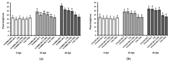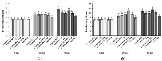 For YN1419, there was no significant difference in plant height (20 dpi: DC1: 28.75 ± 1.39 cm; DC2: 29.00 ±2.25 cm; 40 dpi: DC1: 32.39 ± 1.72 cm; DC2: 32.10 ± 2.51 cm), pseudostem girth (20 dpi: DC1: 8.54 ± 0.52 mm; DC2: 8.88 ± 0.53 mm; 40 dpi: DC1:10.68 ± 0.52 mm; DC2: 9.85 ± 0.60 mm) and leaf number (20 dpi: DC1: 7.50 ± 0.34; DC2: 7.00 ± 0.48; 40 dpi: DC1: 7.75 ± 0.39; DC2: 7.42 ± 0.31), with CK at 20 and 40 dpi, respectively (Figure 5b, Figure 6b and Figure 7b).