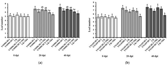 Growth-promoting effects of antagonistic strains YN0904 and YN1419 on leaf number. (a) Growth-promoting effects of antagonistic strain YN0904 on leaf number; (b) growth-promoting effects of antagonistic strain YN1419 on leaf number. Data are presented as means ± standard error. Data with different lowercase letters indicate a significant difference at the 0.05 level.