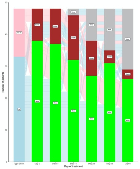Alluvial plot summarizing the administration of antifungal therapy and treatment changes between monotherapy and combination antifungal treatment from baseline and during the first 12 weeks after the diagnosis of an invasive mold infection. IMI: invasive mold infection, IA: invasive aspergillosis, non-IA: non-IA IMI, Mono: monotherapy, Combi: combination therapy, None: no treatment.