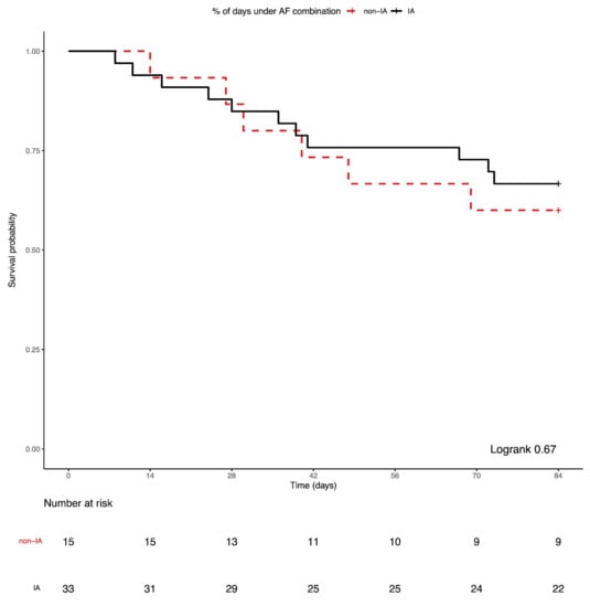 All-cause mortality was 23% at 6 weeks, 30% at 12 weeks, 51% at 24 weeks, and 64% at 1 year post-IMI diagnosis. All-cause 12-week (Figure 2; logrank = 0.67) and 1-year post-IMI diagnosis survival probabilities (Supplementary Figure S1; logrank = 0.92) for IA and non-IA IMI patients did not significantly differ. The median time from IMI diagnosis to death was 130 days: 123 days in the IA group vs. 150 days in the non-IA IMI group (logrank = 0.94). Patients receiving ≥50% of their treatment as combination treatment had worse 12-week survival compared to monotherapy and patients receiving <50% of their treatment as combination (logrank = 0.05, Figure 3a). Notably, while there was no significant difference in 12-week survival based on the mode of treatment in the IA group (logrank = 0.63, Figure 3b), non-IA IMI patients receiving ≥50% of their treatment as combination had worse 12-week survival compared to monotherapy and patients receiving <50% of their treatment as combination (logrank = 0.03, Figure 3c).