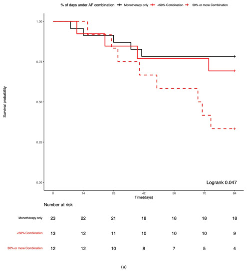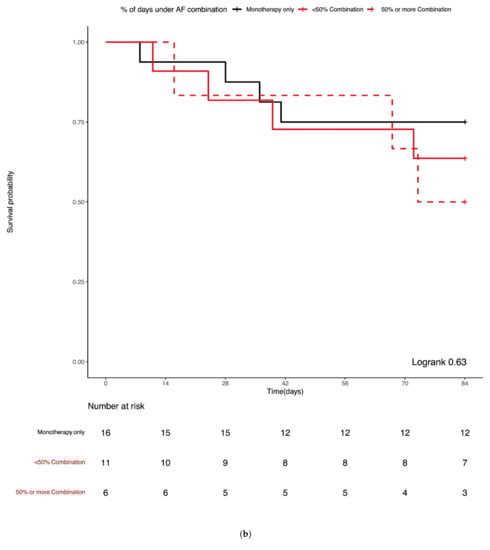 Combination therapy was defined as the concomitant administration of two or more antifungal agents from different classes for a minimum of 3 consecutive days. Considering the multiple changes in antifungal therapy observed in this cohort, and in order to facilitate analyses, the following considerations were made: (i) Patients who received only monotherapy were considered as a separate “monotherapy group”. (ii) Patients who received combination antifungal therapy were divided into two groups: (a) “<50% combination therapy group”, including patients whose treatment course included combination therapy in <50% of the overall treatment duration, and (b) “≥50% combination therapy group”, including patients whose treatment course consisted of ≥50% of combination treatment.
