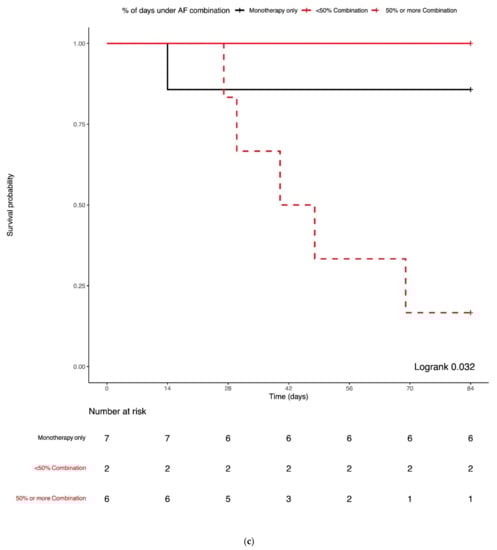 Kaplan–Meier survival curves of all-cause 12-week mortality after the diagnosis of an invasive mold infection (IMI) according to the number of days of combination therapy administration: Monotherapy only, and <50% and ≥50% of combination treatment of their entire treatment course for: (a) all patients with IMI, (b) patients with invasive aspergillosis (IA), and (c) patients with non-IA IMI. IMI: invasive mold infection, IA: invasive aspergillosis, non-IA: non-IA IMI, AF: antifungal treatment.