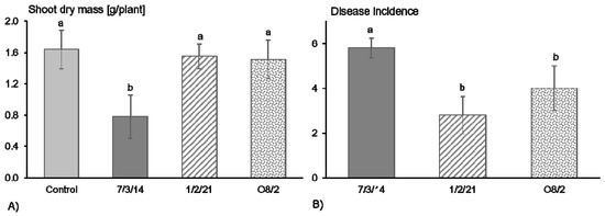 (A) Effect of different Rhizoctonia solani AG1-IB isolates (7/3/14, 1/2/21, O8/2) on lettuce growth (cv. Tizian) and (B) on disease incidence four weeks after pathogen inoculation and cultivation under controlled conditions. Different letters indicate significant differences between treatments according to the least significant difference (LSD) test (p ≤ 0.05).