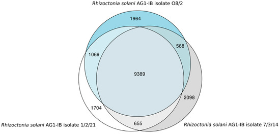 Euler diagram of the gene-based genome comparison for the completely sequenced R. solani AG1-IB isolates. The core genome of all isolates consists of 9389 genes. These genes are present in the genomes of all sequenced R. solani AG1-IB isolates: O8/2 [EMBL-EBI: CAJZAE010000001-CAJZAE010001402], 1/2/21 [EMBL-EBI: CAJZAD010000001-CAJZAD010002093] and 7/3/14 [EMBL-EBI: CDGK01000001–CDGK01018395 (Contigs); LN679100–LN679996 (Scaffolds)]. For computation of the Venn diagram, default settings of EDGAR 3.0 [34,35,36] were applied.