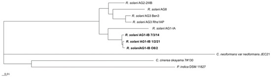 R. solani isolates representing the anastomosis groups AG1-IA, AG1-IB, AG2-2IIIB, AG3 and AG8 cluster together. The R. solani AG1-IB isolates build their own cluster in the tree. The other species of the phylum Basidiomycota included in the phylogenetic analysis are only distantly related to R. solani. Coprinopsis cinerea okayama 7#130 and Piriformospora indica DSM 11827 cluster within one group. Whereas, Cryptococcus neoformans var. neoformans JEC21 is only distantly related to the other fungi. While, C. cinerea and P. indica belong to the class Agaricomycetes, C. neoformans is a member of another class (Tremellomycetes).