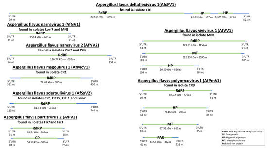 A homogeneous sub-population of 62 strains was built by sorting an equal number of aflatoxigenic/non-aflatoxigenic and sclerotia-producing/non-producing isolates, and all strains belonged to the L-type (Table 1). RNA-seq analysis revealed that about 20% of our A. flavus population were infected by one or more mycoviruses (Table 2). Among these strains, 4 isolates were infected by more than one virus, and 8 with only one. An overview of the viruses identified in the present work and their genomic organization are reported in Figure 1 and Table 3.