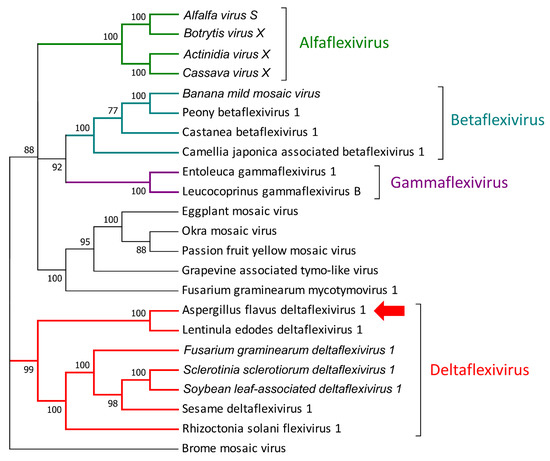 The first identified virus belongs to the Tymovirales order and presents similarities to an undefined virus isolated from soil samples (QDH90368.1) and to Lentinula edodes deltaflexivirus 1 (QOX06047.1): it shows two conserved domains along the first ORF (from nucleotide 29 to nucleotide 6007), the first at the 5′ (about 1 Kb from the first nucleotide), which shows high homology to viral methyltransferases, and the second, which is located about 4 Kb from the first nucleotide, which encodes for a viral helicase. The genome then presents another two ORFs encoding for two proteins with no conserved domain and with no homology with other proteins in NCBI databases. The phylogenetic analysis of the RdRP sequence displayed a good relationship with Lentinula edodes deltaflexivirus 1 (QOX06047.1), confirming its relationship with the Deltaflexiviridae family (recognized from year 2019 by the International Committee for Taxonomy of Viruses (ICTV), https://talk.ictvonline.org/, accessed on 2 July 2021), and for this reason, we propose the name Aspergillus flavus deltaflexivirus 1 (AfDfV1) (Figure 2).