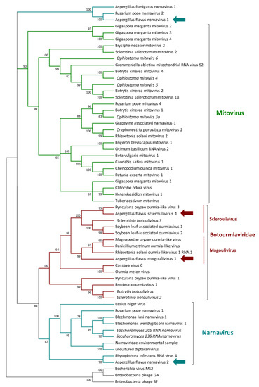 Two viruses showing homology to the Narnaviridae family [40] were identified: the first one presents a three segmented genome, with apparently no conserved domain (as observed by the CDD/SPARCLE analysis) and probably belonging to a new group of narnaviruses defined as splipalmiviruses [41]. The second virus possesses a 3486 nt genome and displays 55.6% identity with Plasmopara viticola lesion-associated narnavirus 32 (QIR30311.1) [42]. The phylogenetic analysis suggested that, despite both viruses being grouped with other narnaviruses, they probably belong to two different clades, as indicated by their different genome size and phylogenetic placement (Figure 3). We propose for the two viruses the names Aspergillus flavus narnavirus 1 (AfNV1) and Aspergillus flavus narnavirus 2 (AfNV2), respectively. Two other new viruses belonging to the Lenarviricota phylum were found: the first one is a 2863 nucleotides-long segment which displays a 2043 nucleotides ORF encoding a putative RdRP. The protein showed 88.14% identity to Spodoptera exempta virus TenAfr-2017 (QQZ00864.1), but no conserved domain was detected during the CDD/SPARCLE analysis. The second identified viral genome was a 3009 nt long sequence that exhibited a 2151 nucleotides ORF encoding for a putative RdRP, which shares 43.3% identity to Oidiodendron maius ourmia-like virus 1 (QNN89181.1) [41]. The phylogenetic placement of both viruses confirmed that they belong to the Botourmiaviridae family [43]: the first was named Aspergillus flavus magoulivirus 1 (AfMoV1) due to its phylogenetic relationship with the Magoulivirus genus, while the second one was named Aspergillus flavus scleroulivirus 1 (AfSoV1), due to its phylogenetic relationship with the Scleroulivirus genus (Figure 3).