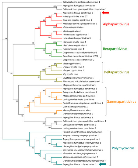 Additionally, a virus with a bipartite genome was also identified: the first RNA (RNA1) is 1849 nt long and presents a 1701 nt ORF that encodes for a putative RdRP, as also suggested by the CDD/SPARCLE analysis that identified an RT-like domain. The closest proteins are two putative RdRP encoded by Hubei partiti-like virus 27 (APG78241.1) [44] and by Lichen partiti-like RNA virus sp. (BCD56390.1) [45], both displaying an amino acid sequence with 55% identity to the newly identified virus. The second segment (1820 nt long) displays a unique ORF of 1530 nt, which encodes for a protein with no conserved domain, but with some similarities to the putative coat protein of parti-like and partitiviruses. The phylogenetic placement suggested that this virus belongs to the Partitiviridae family [46] and, more specifically, to the Alphapartitivirus genus (Figure 4); for this reason, we propose the name of Aspergillus flavus partitivirus 2 (AfPV2).