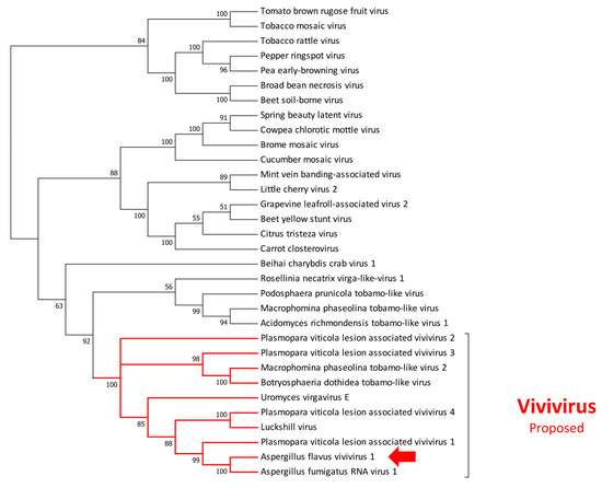 Finally, we identified a virus with three putative segments, the first one (RNA1) is 3592 nt long, displays a 3459 nt long ORF, and putatively codes for a protein with a conserved RdRP domain. The second is 3509 nt long with a 3273 nt long ORF and encodes a protein with two conserved domains: a methyltransferase at the 5′ and a viral helicase at the 3′. The third segment is 1942 nucleotides long, presents a 1671 nt long ORF, and encodes for a protein with no detected conserved domain. All three proteins displayed a relatively good degree of conservation with Aspergillus fumigatus RNA virus 1 (txid2747487), a virus recently reported in NCBI [47]. For the first two segments, several other similarities were also observed with a recently reported virus associated with Plasmopara viticola. Similarly to what was reported for Plasmopara viticola lesion-associated vivivirus 1 [42], we observed a conserved motif both at the 5′ and 3′ termini (Supplementary Figure S2), suggesting an association of these three segments as a new tripartite virus. Due to its phylogenetic placement (Figure 5), we named it Aspergillus flavus vivivirus 1 (AfVV1).
