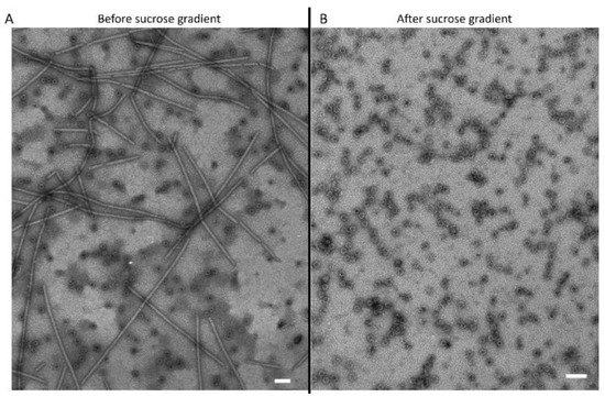 Transmission electron microscopy (TEM) imaging of virus particles isolated and purified from the MN1 strain. (A) Virus particle before the sucrose gradient separation, and (B) virus particles after a 50% to 20% sucrose gradient. Bar in each panel represents 100 nm length.