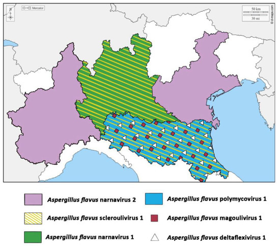 From a geographical perspective, it is interesting to observe that viruses seem to be associated with specific regions (Figure 7). With the only exception of Aspergillus flavus narnavirus 2, that was present both in Piemonte and Veneto regions, which do not share borders, all the other viruses resulted strictly associated to the indigenous population of specific areas. For example, Aspergillus flavus partitivirus 2 was found only in isolates from Friuli-Venezia Giulia, Aspergillus flavus deltaflexivirus was found associated to the Emilia-Romagna region, whereas Aspergillus flavus narnavirus 1 is associated to isolates from Lombardia. These observations are interesting under an ecological perspective, pointing to an apparently limited movement of the fungal population also between bordering territories. This evidence suggests that mycoviruses could thus be exploited as molecular markers to be used for the monitoring of the fungal populations’ movement among territories, possibly representing an alternative to the use, in the future, of the more laborious molecular analyses currently applied for this purpose [66].
