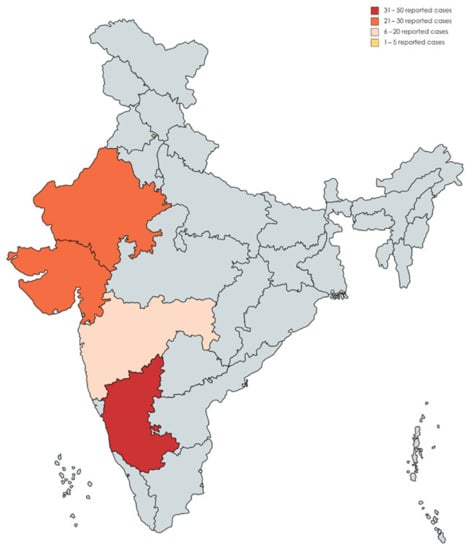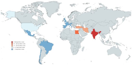 On analyzing the sources of the reported cases, India was the most contributing country (55.5%) [,,,,,,,,,,,,,,,], followed by Egypt (17.8%) [,], Iran (9.9%) [,,,], Turkey (6.3%) [,], and the United States of America (4.7%) [,,,,,,,,]. See Figure 4.