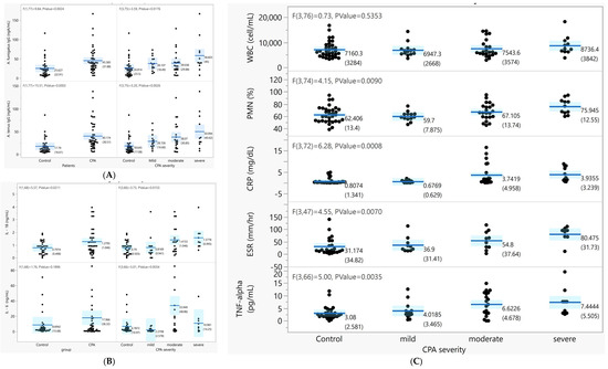 Overall, in peripheral blood, the cellular distribution, including WBC and platelet counts and the percentage of polymorphic neutrophils (PMN%), were not different between the CPA and control groups. The IL-6 and IL-1B levels in the blood were both significantly higher in the CPA group than in the control group and increased with the severity of CPA (p < 0.05, Figure 1B). The PMN%, CRP, and ESR were significantly increased with severity in CPA (p < 0.05) (Figure 1C).