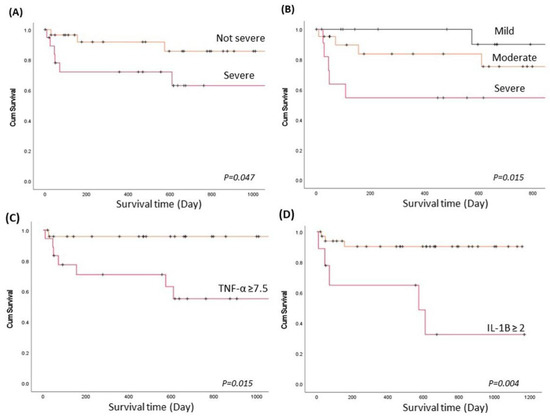 Long-term follow-up for the 3-year survival was evaluated in the current study. The overall mortality rates were 18.3% (9/49) in the CPA group and 11.1% (4/36) in the control group (p > 0.05). In CPA, the IL-1B (2.4 ± 1.03 vs. 1.0 ± 0.8 pg/mL, p = 0.001), TNF-α (10.9 ± 4.8 vs. 5.0 ± 3.9 pg/mL, p = 0.001), and visual severity (r2 = 0.19, p = 0.026) were higher in patients who died than in surviving patients. Survival analysis using the Kaplan–Meier method showed that patients with earlier mortality presented with higher severity of CPA either by computer-based assessment or by the visual method (p < 0.05, Figure 2A,B). Moreover, patients with CPA had a poor prognosis if the blood IL-1B level was higher than 2 pg/mL or if the TNF-α level was higher than 7.5 pg/mL at study entry compared to those with lower IL-1B and TNF-α levels in the blood (p < 0.05, Figure 2C,D).