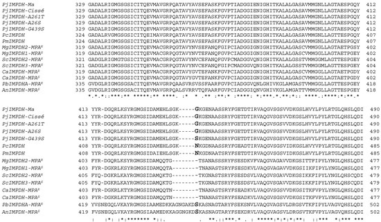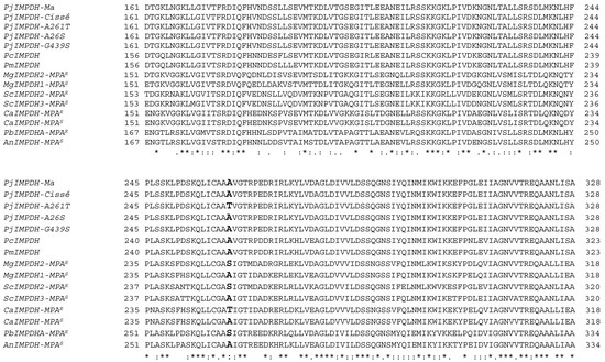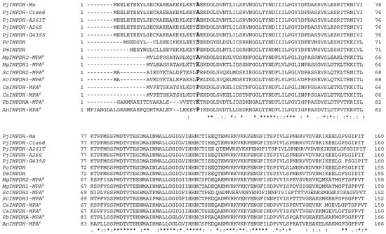 Sequence alignment of IMPDH proteins of Pneumocystis jirovecii, Pneumocystis carinii, Pneumocystis murina, Meyerozyma guilliermondii, Saccharomyces cerevisiae, Candida albicans, Penicillium brevicompactum and Aspergillus nidulans. Identical, strongly and weakly conserved residues are indicated by asterisks, double points and single points, respectively. Dashes indicate gaps. Polymorphic residues of P. jirovecii IMPDH and the analogous residues in other fungi are indicated in bold. PjIMPDH-A261T: IMPDH sequence of P. jirovecii with a missense mutation Ala261Thr identified in the present study; PjIMPDH-A26S: IMPDH sequence of P. jirovecii with a missense mutation Ala26Ser identified in the present study; PjIMPDH-G439S: IMPDH sequence of P. jirovecii with a missense mutation Gly439Ser identified in the present study; PjIMPDH-Ma: IMPDH sequence of P. jirovecii retrieved from Ma and colleagues’ proteome [17]; PjIMPDH-Cissé: IMPDH sequence of P. jirovecii retrieved from Cissé and colleagues’ proteome [18]; PcIMPDH: IMPDH sequence of Pneumocystis carinii; PmIMPDH: IMPDH sequence of Pneumocystis murina; MgIMPDH1-MPAS: MPA-sensitive IMPDH1 of Meyerozyma guilliermondii; MgIMPDH2-MPAR: MPA-resistant IMPDH2 of Meyerozyma guilliermondii; ScIMPDH2-MPAR: MPA-resistant IMPDH2 of Saccharomyces cerevisiae; ScIMPDH3-MPAS: MPA-sensitive IMPDH3 of Saccharomyces cerevisiae; CaIMPDH-MPAR: IMPDH of a MPA-resistant strain of Candida albicans; CaIMPDH-MPAS: MPA-sensitive IMPDH of Candida albicans; PbIMPDHA-MPAR: MPA-resistant IMPDH-A of Penicillium brevicompactum; AnIMPDH-MPAS: MPA-sensitive IMPDH of Aspergillus nidulans.