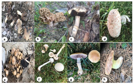 General view of all mushrooms collected: (a) Helvella leucopus, (b) Morchella esculenta, (c) Agaricus bitorquis, (d) Coprinus comatus, (e) Coprinellus micaceus, (f) Agrocybe dura, (g) Psilocybe coronilla, (h) Suillus collinitus.