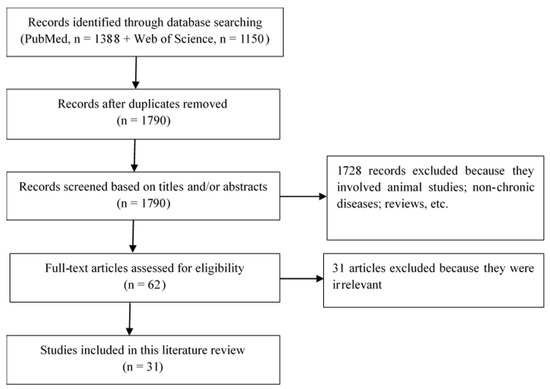 The search results identified 2538 studies. After removing duplicates, we screened 1790 study titles and/or abstracts and excluded 1728 which were unrelated to the present study. Ultimately, 62 full-length articles were assessed for eligibility, and 31 were selected for qualitative analysis and included in this review. This selection flow is presented in Figure 1. The 31 studies detailed below address the association of Malassezia yeast with chronic diseases, including psoriasis, atopic dermatitis (AD), chronic rhinosinusitis (CRS), asthma, cystic fibrosis (CF), HIV infection, inflammatory bowel disease (IBD), colorectal cancer (CRC), and neurodegenerative diseases. We will present the association of Malassezia with psoriasis.