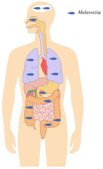 It is recognized that the skin is the main ecological niche of Malassezia, and its responsibility for some skin infections, such as pityriasis versicolor and seborrheic dermatitis, is no longer the subject of debate. The different anatomical sites, outside the skin, in which Malassezia has been detected, either in the context of chronic diseases or in healthy individuals, are illustrated in Figure 2. However, its causative role in other inflammatory skin diseases including psoriasis and atopic dermatitis remain under discussion. Given the multifactorial cause of these two diseases, the exact role of Malassezia in their physiopathogenesis remains to be clarified. Regarding psoriasis, Malassezia overgrowth, especially within skin lesions (Table 1) suggests that Malassezia may play a role in its exacerbation [16,17]. However, whether Malassezia plays pathogenic role by causing the lesions or whether it is a simple opportunistic colonizer of pre-existing psoriasis lesions remain under discussion. Regarding atopic dermatitis, we found no evidence of any link between Malassezia abundance on the skin and the severity of this disease. In contrast, increased anti-Malassezia IgE antibodies levels have been associated with AD flare-ups (Table 3).