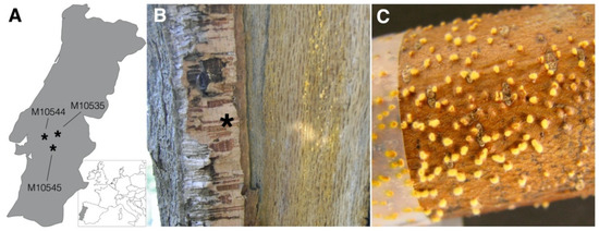 Collection sites and in plant habit of Cryphonectria naterciae. (A) Map section of western–central Europe (framed) and magnification of Portugal (gray). Shown are the collection sites of the three specimens analyzed by RNA-seq. (B) Removal of the cork bark (asterisk) revealed beneath the yellow to orange mycelium of C. naterciae. (C) Small stem segment of the European chestnut inoculated with an agar plug of C. naterciae, showing yellow mycelium breaking through the bark.