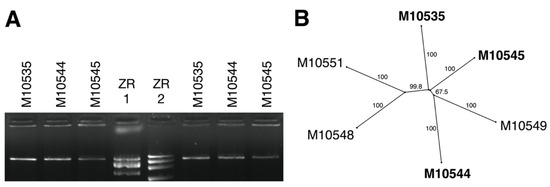 No conserved domain was found in the putative ORF1 protein using the Conserved Domain Database (CDD) search (https://www.ncbi.nlm.nih.gov, accessed on 22 July 2021). However, a protein search at CDD confirmed that the predicted ORF2 protein contains an RdRp domain (RdRp_4; pfam02123; Cd length: 465), exhibiting conserved motif characteristics detected in members of the proposed Fusagraviridae members in former studies (e.g., Fusarium poae dsRNA virus 2 and 3 [13], Trichoderma asperellum dsRNA virus 1 [55], or Macrophomina phaseolina fusagravirus 2–5 [56]), as well as in other dsRNA viral families, such as Colletotrichum fructicola chrysovirus 1 [57] or Macrophomina phaseolina chrysovirus 2 RNA1 [56]. The similarity in the RdRp region supported additionally that the M10544-dsRNA is a dsRNA fusagravirus. Moreover, the genome sequence analysis showed a putative shifting heptamer sequence ‘AAAAAAC’ located upstream of the stop codon of the hypothetical protein ORF1 (Figure 3).