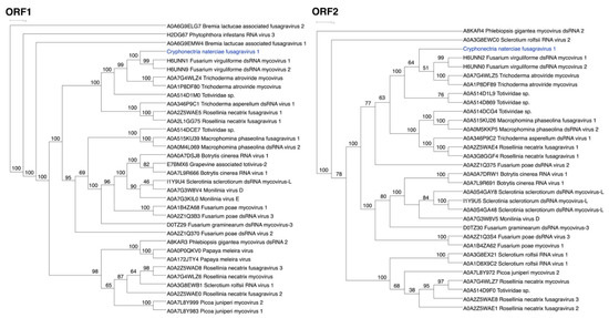 Phylogenetic analyses of amino-acid alignments resulting from ORF1 and ORF2 BLASTp searches of the new mycovirus Cryphonectria naterciae fusagravirus 1 (CnFGV1). Blue letters highlight the phylogenetic position of CnFGV1 in both neighbor joining trees. Names and UniProt accession numbers of related fusagraviruses included in the analyses are indicated in the trees. The numbers at nodes are values of >50% of 1000 bootstrap replicates.