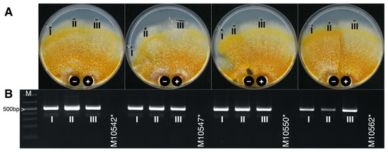Pairwise co-cultivation of CnFGV1-positive (+) and CnFGV1-free (−) strains of C. naterciae. (A) After incubation for 10–15 days at 25 °C, two inocula from the recipient side (I and II) and one from the donor side (III) were sub-cultivated for 4–5 days. (B) Gel electrophoresis of Cn-Vir-ORF1 fragments used to verify the virus presence. Negative controls of pairing tests are virus-free strains labeled with asterisks. M: Thermo Scientific GeneRuler 1 kb Plus DNA Ladder (SM1334).