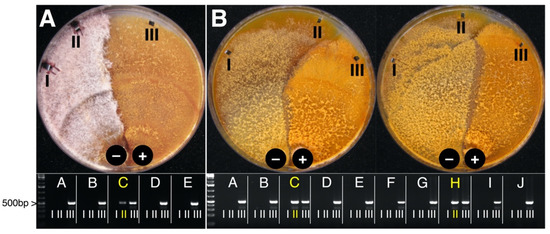 Pairwise co-cultivation of CnFGV1-positive (+) Cryphonectria naterciae and CnFGV1-free (−) Cryphonectria spp. (A) Donor strain in co-culture with replicate M2270-C of C. radicalis. (B) Donor strain in co-culture with replicate M9290-C and M9290-H of C. carpinicola. Agarose gels below show Cn-Vir-ORF1 fragments of five (A–E) or 10 (A–J) replicates to verify the virus transmission. The position III is from the donor side and always CnFGV1-positive. Yellow letters highlight the positive CnFGV1-transmission to the recipient.