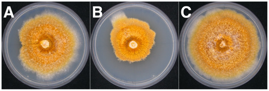 Morphology of isogenic strains of Cryphonectria naterciae after 7 days incubation, shown here by way of example using the recipient strain M10562. (A) Infected from the donor M10535 with some sectoring at left side. (B) Infected from the donor M10544 showing an extreme sectoring with densely interwoven mycelium. (C) Infected from the donor M10545 with regular morphology.