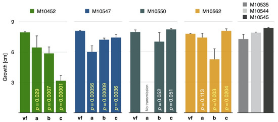 Growth rate of CnFGV1-positive and virus-free isogenic strains of Cryphonectria naterciae. Compared are isogenic virus-free strains (= vf) with experimentally infected recipients M10452, M10547, M10550, and M10562 of C. naterciae. Donors are a = M10535, b = M10544, and c = M10545. Gray columns show the growth of donor strains. Column height represents growth after 7 days of incubation. Vertical black lines indicate the standard deviation of three culture replicates, and vertical yellow p-numbers highlight significant growth differences between the virus-free and each infected strain. White p-numbers are nonsignificant considering a critical value of p < 0.05.