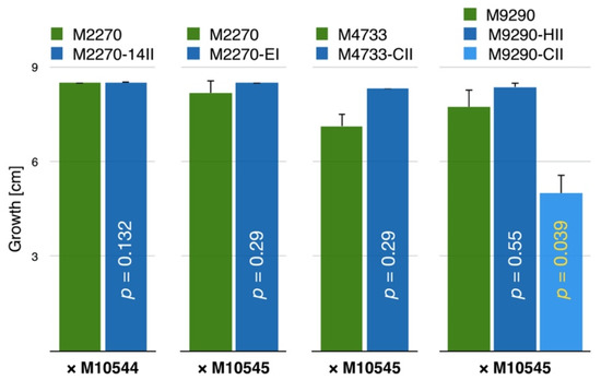Growth rate of CnFGV1-positive and virus-free isogenic strains of Cryphonectria spp. Column height represents the growth of isogenic virus-free strains (green) or infected recipient strains (dark and light blue) of C. radicalis (M2270, M4733) and C. carpinicola (M9290). Donor strains are C. naterciae M10544 and M10545. Column height represents growth after 7 days incubation. Vertical black lines indicate the standard deviation of three culture replicates, and vertical yellow p-numbers highlight significant growth differences between the virus-free and each infected strain. White p-numbers are nonsignificant considering a critical value of p < 0.05.