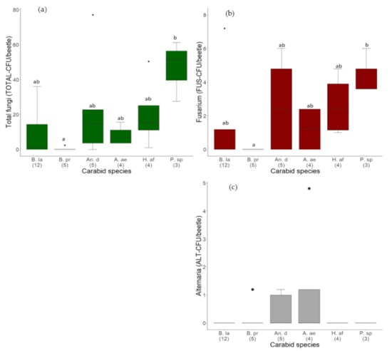 Load of (a) Total fungi (TOTAL-CFU/beetle), (b) Fusarium fungi (FUS-CFU), and (c) Alternaria fungi (ALT-CFU), detected on the body of carabid beetles with a culture-dependent method. Number of individuals per beetle species presented in brackets. Carabid species are sorted from lightest to the heaviest (median body weight). Species code according to Table 1 (abbreviations short). Black dots in the boxplots are outliers or only one observation per carabid species in (b,c).