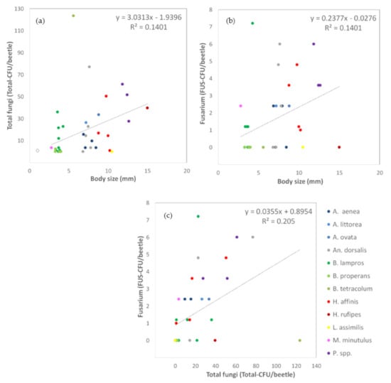 The number of adhered propagules of total fungi (TOTAL-CFU/beetle) as well as of Fusarium (FUS-CFU/beetle) increased with the body size of the carabid beetles. More fungal propagules attached to the body surface of larger beetles, shown by positive moderate correlation coefficients (total fungi: rs = 0.44, p = 0.005, N = 39, Figure 3a; Fusarium: rs = 0.43, p = 0.007, N = 39, Figure 3b). Furthermore, the load total fungal load correlated significantly positively with the number of Fusarium propagules on the body surface (rs = 0.71, p = 0.000, N = 39, Figure 3c). No significant correlations were found for Alternaria propagules since their load and frequency were very low in this approach.)