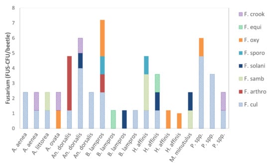 Propagules of the phytopathogenic and mycotoxigenic genus Fusarium adhered to the body surface of 19 out of 39 investigated carabid beetles (Figure 2b; Figure 4). In total, 59.8 CFU were identified as Fusarium, representing 8.9% of all detected total fungal CFU (Table 5). In the median, 0.0 (IQR 1.4) FUS-CFU/beetle of Fusarium adhered to the carabid beetles. The highest load of Fusarium (7.2 FUS-CFU/beetle) was detected on the body surface of an individual of B. lampros, the smallest beetle species investigated in this approach (Figure 4). However, the number of attached Fusarium propagules varied significantly between the six most frequent carabid species (H = 13.45, df = 5, p = 0.02, Table 1). Fusarium propagules adhered significantly less to individuals of B. properans than to Poecilus spp. (Figure 2b).
