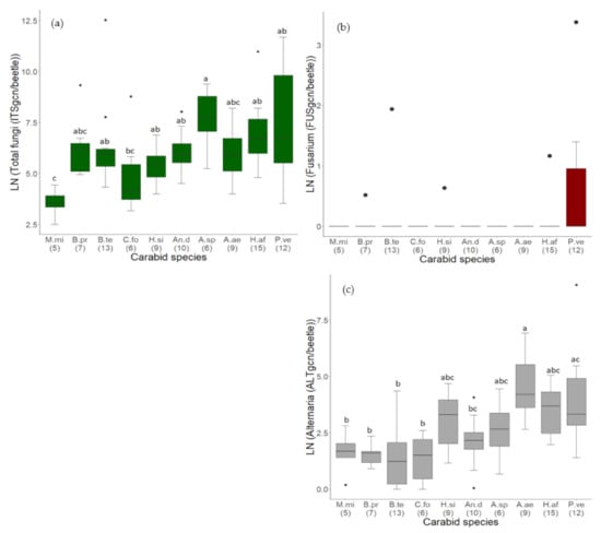 Load of fungal DNA (genome copy numbers, gcn) in samples of carabid beetles comprising the body surface and inner body parts. All data was LN(x + 1)-transformed. (a) Total fungi (ITSgcn/beetle), (b) Fusarium (FUSgcn/beetle) and (c) Alternaria (ALTgcn/beetle). The number of samples per species is given in brackets and carabid species are sorted from the lightest to the heaviest. Significant differences between species are indicated with a, b, or c. Species code according to Table 2 (abbreviations short). Black dots in the boxplots are outliers or only one observation per carabid species in (b).
