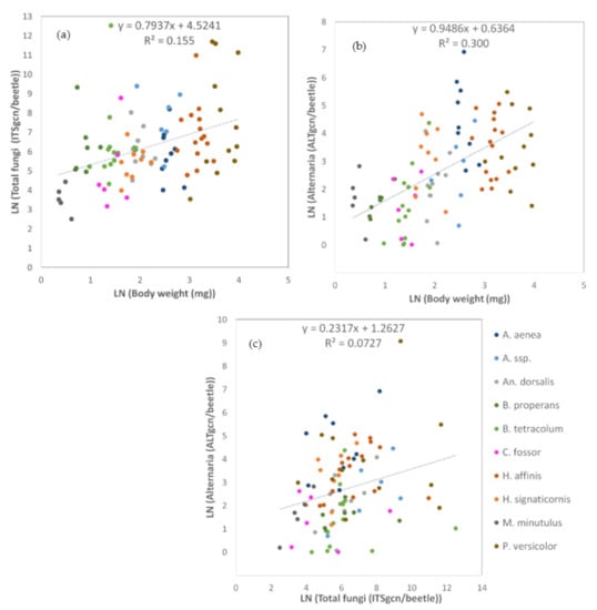 Effects on the load of fungal DNA (genome copy numbers, gcn) in samples of carabid beetles, comprising the body surface and inner body parts. (a) Effects of body weight (mg) on the load of total fungi (ITSgcn/beetle). (b) Effects of body weight (mg) on the load of Alternaria (ALTgcn/beetle). (c) Effects of the load of total fungi (ITSgcn/beetle) on the load of Alternaria DNA (ALTgcn/beetle). The carabid species are indicated in different colors in Figure c. Species code according to Table 2 (abbreviations long). The dotted lines show a linear trend combined for all carabid beetles.